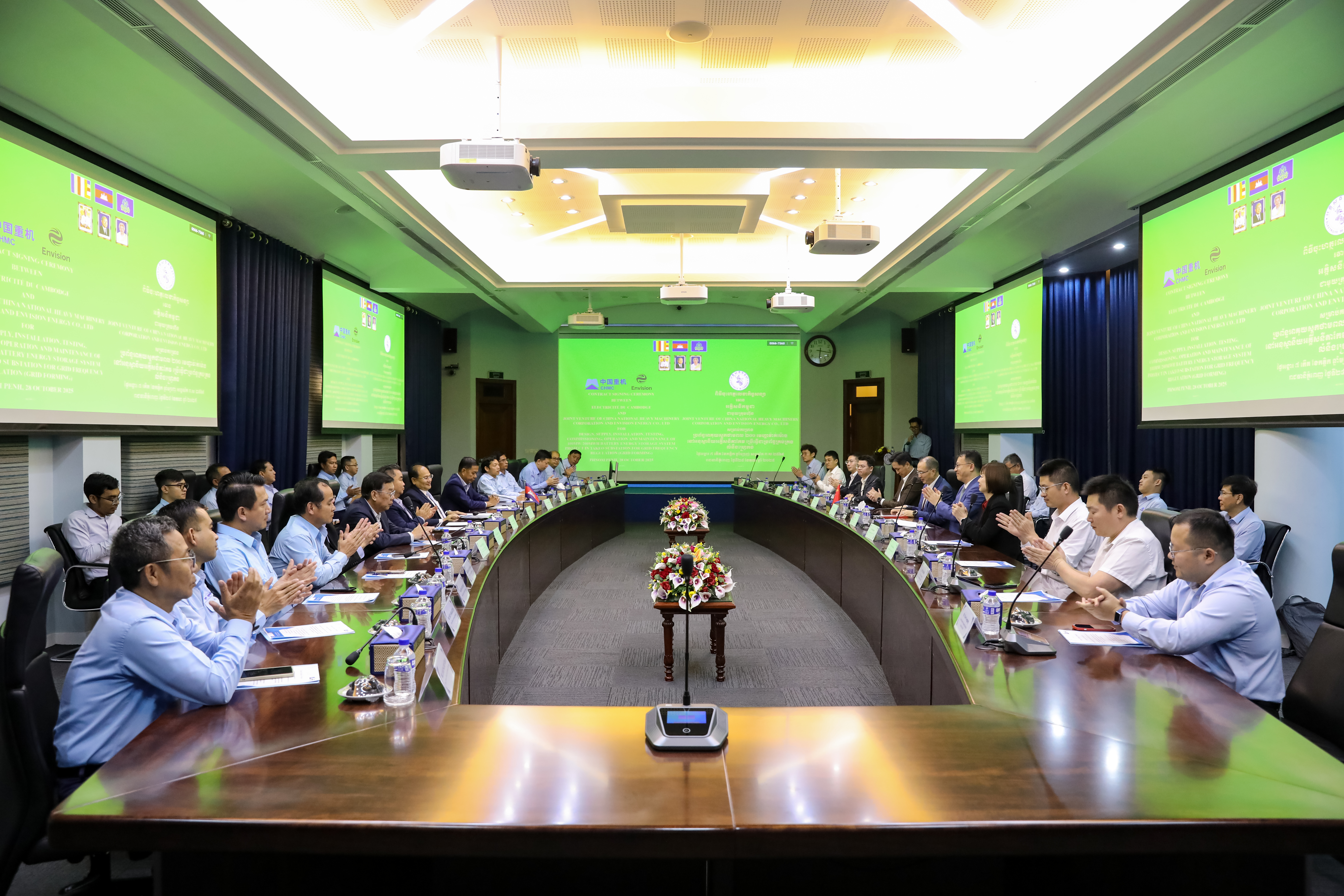 Recently, the Joint Venture led by China National Heavy Machinery Corporation (CHMC) formally signed the contract for 100MW/200MWh Grid-Forming Battery Energy Storage Project with Electricite Du Cambodge (EDC). Dr. Praing Chulasa, President of EDC, Xiao Ping, Chairman and Managing Director of CHMC, Xu Jia, Deputy Managing Director of CHMC, as well as members of the Joint Venture, attended the signing ceremony.